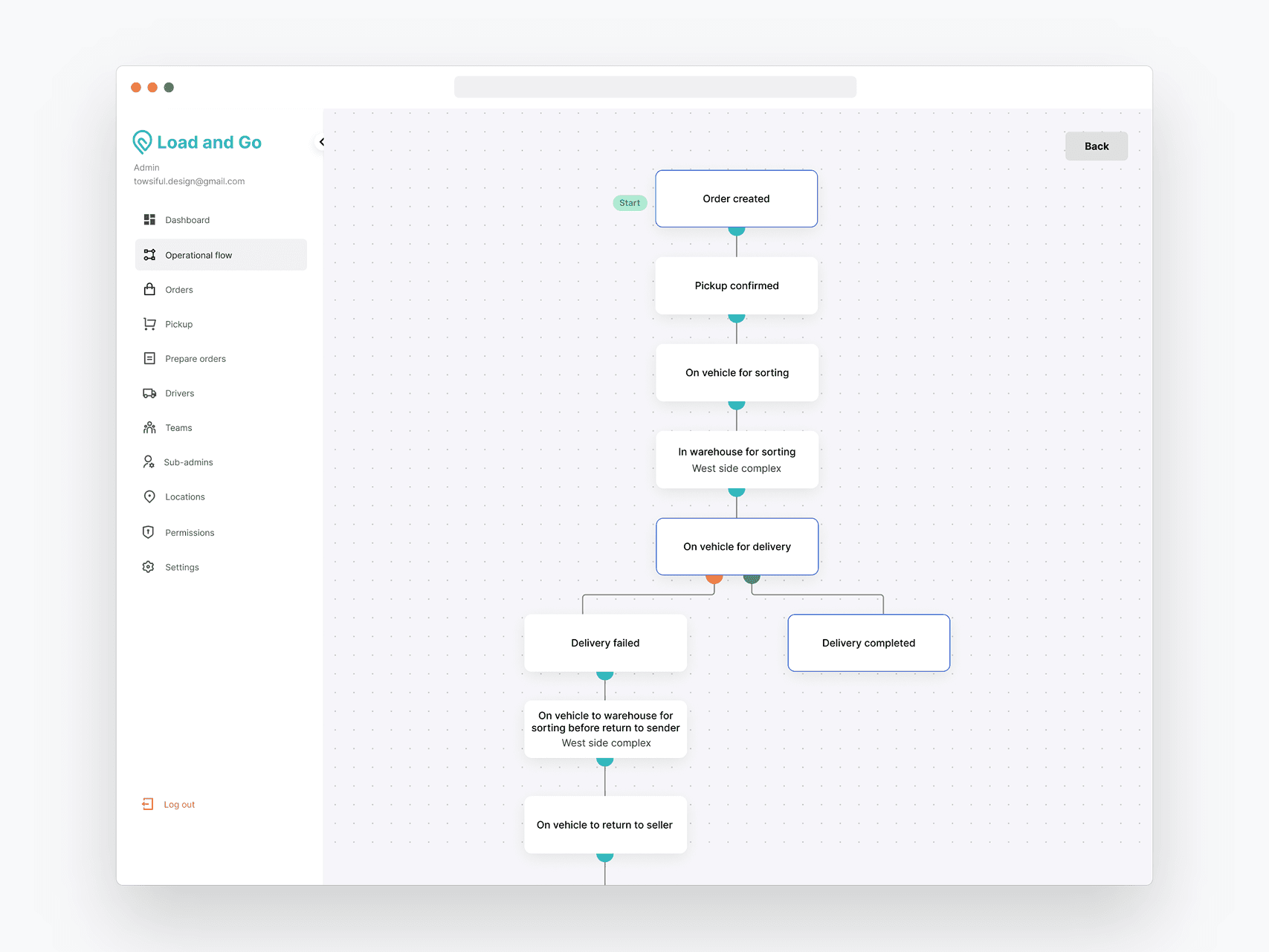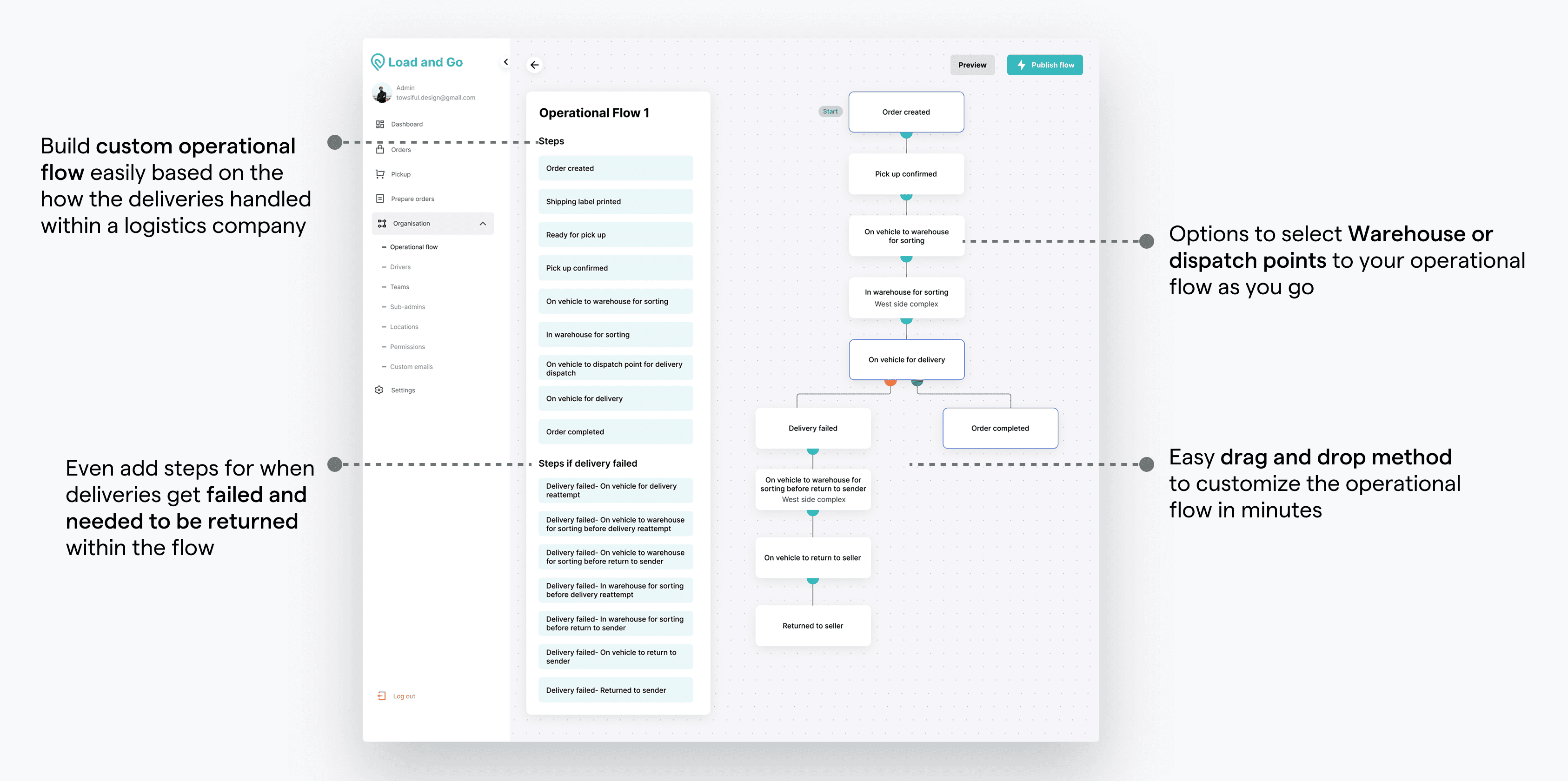The goal was to incorporate easy-to-build operational flow from start to finish. The users can create multiple operational flows to manage all kinds of deliveries with a degree of complexity like adding warehouse locations and dispatch points. The users have the freedom to plan for all outcomes that may occur in a delivery flow i.e. from successful deliveries to failed deliveries.
