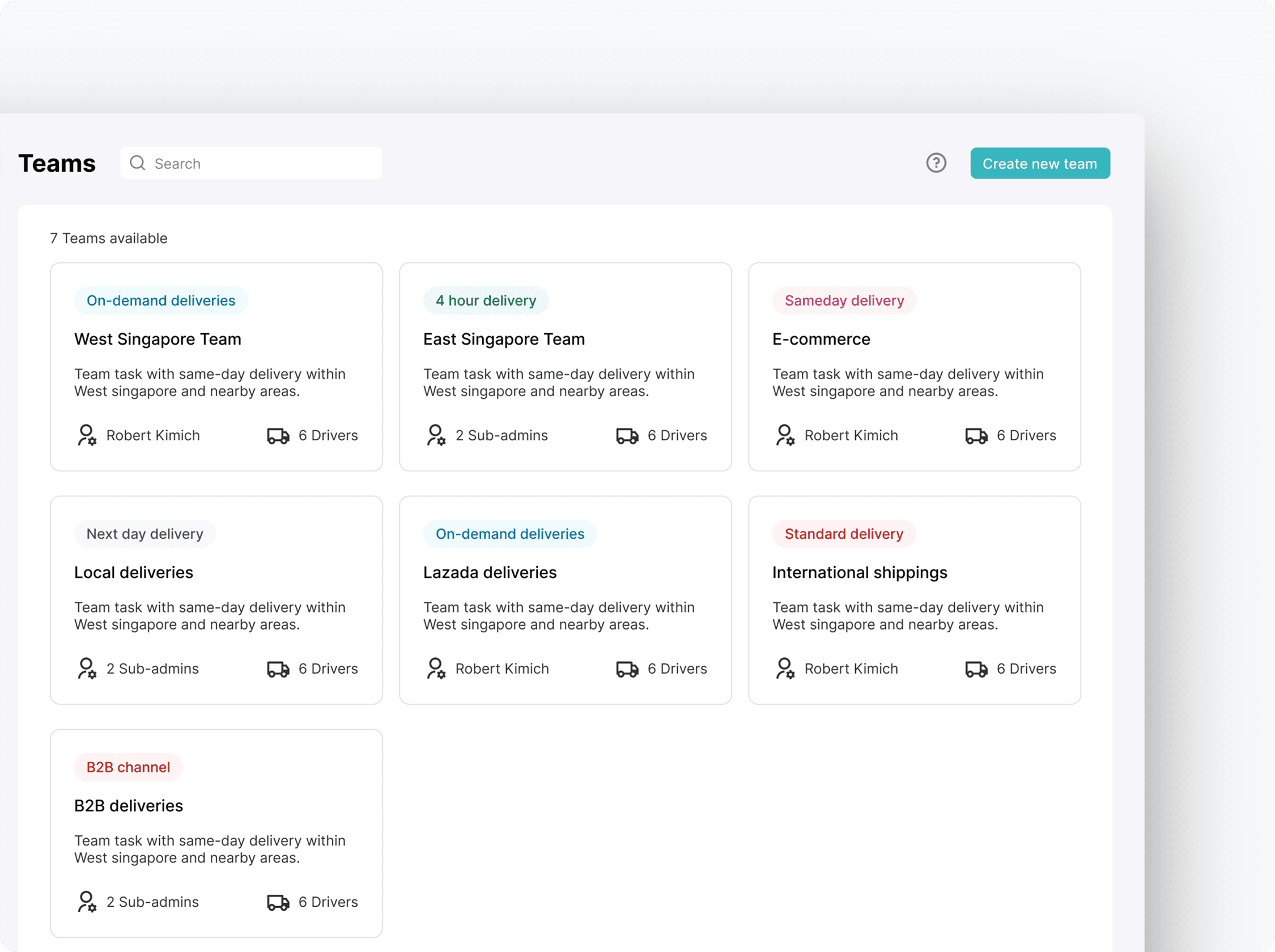 Logistics managers have their hands full most of the time managing merchants, drivers, and warehouse workers. Giving the logistics managers a level of automation by setting up teams to do different tasks reducing the amount of stress and errors.
