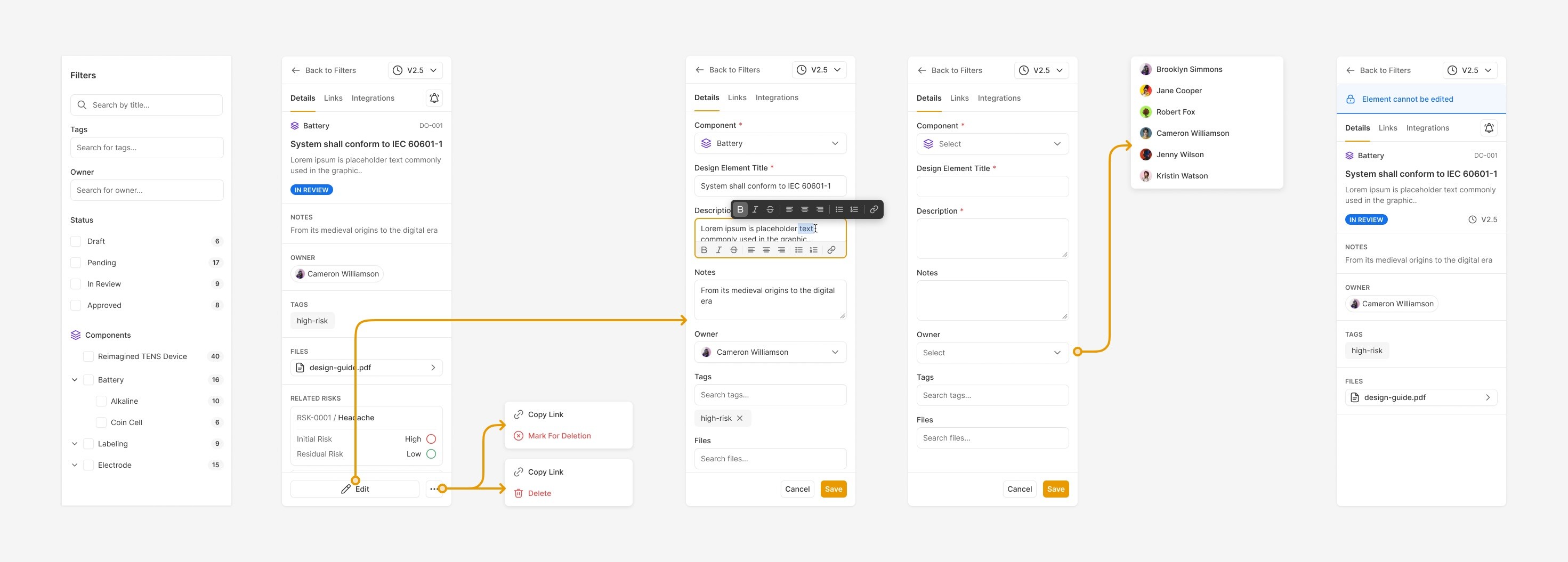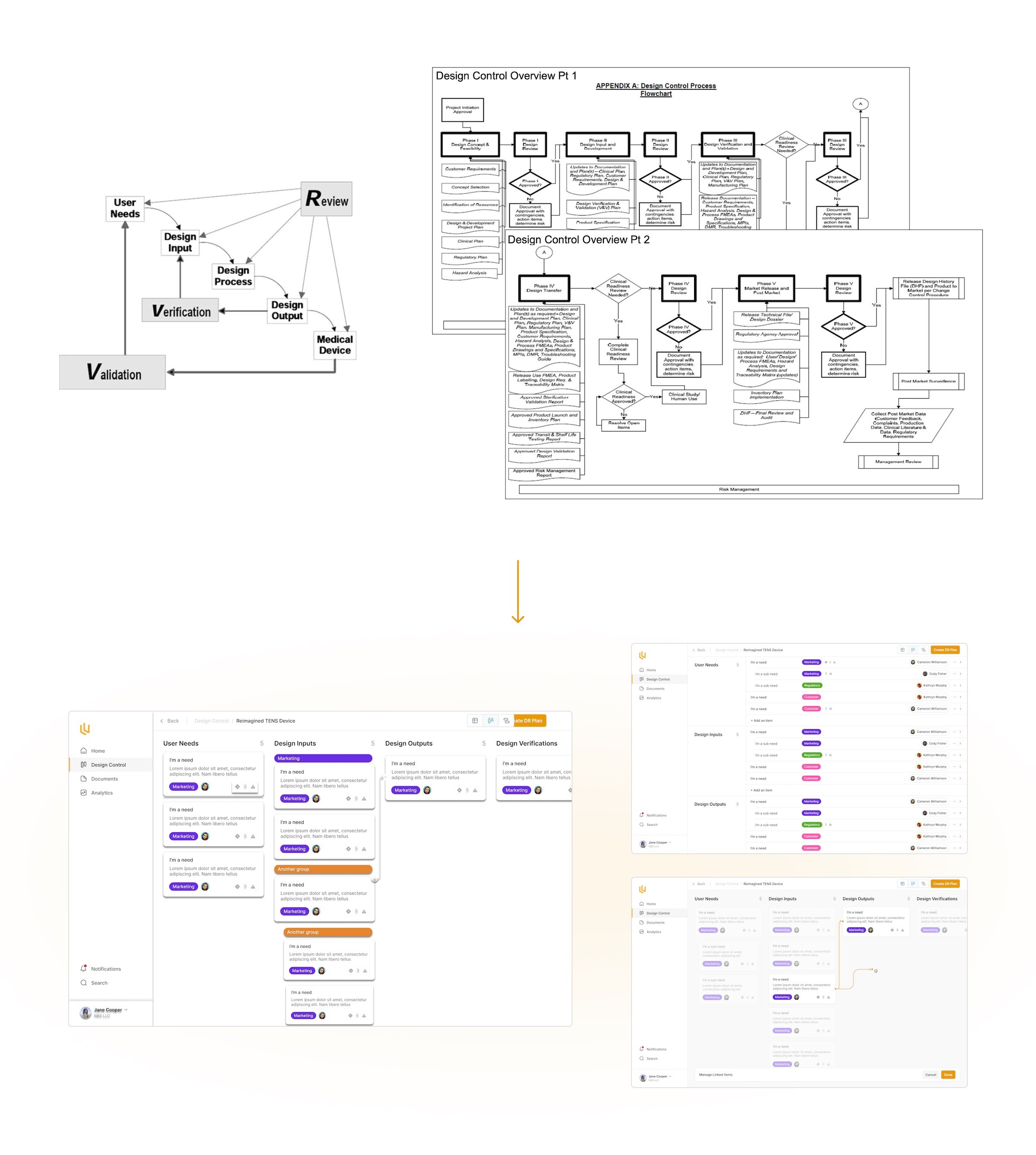 Right at the beginning of our partnership we began deconstructing how medical software and hardware devices get approved. Over a number of weeks we dove into the FDA's documentation on this, exploring various ways we could contextualize this in the product. This quickly began to turn into some rough, preliminary mockups of what would eventually become Ultralight's 'Design Control' feature