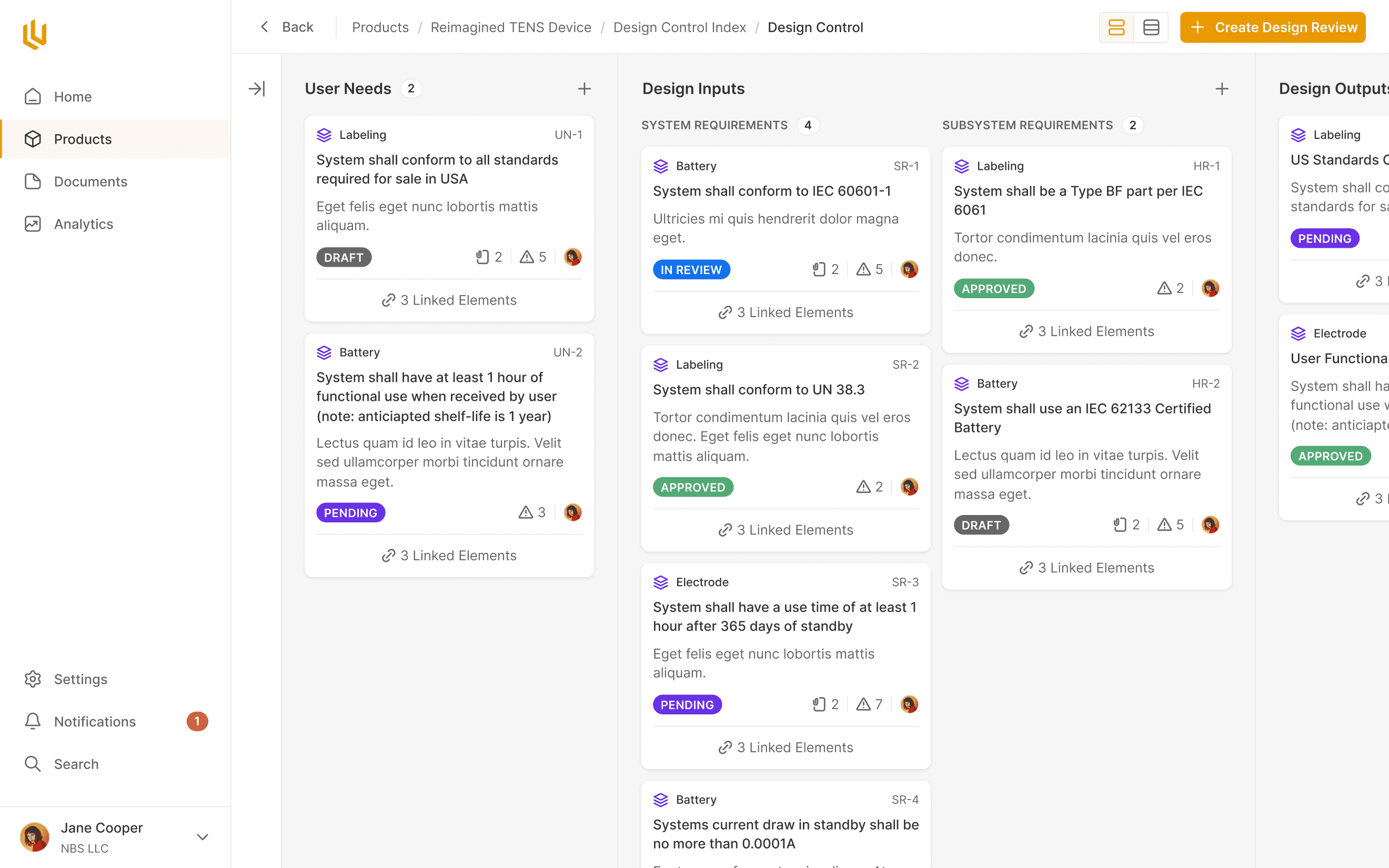 The Design Control module within Ultralight is the core of where design decisions, requirements and review take place. From the very conception of a med device, the every decision made has to be documented. The Design Control allows engineers and managers to clearly note decisions throughout the product design process, making future approvals a breeze.