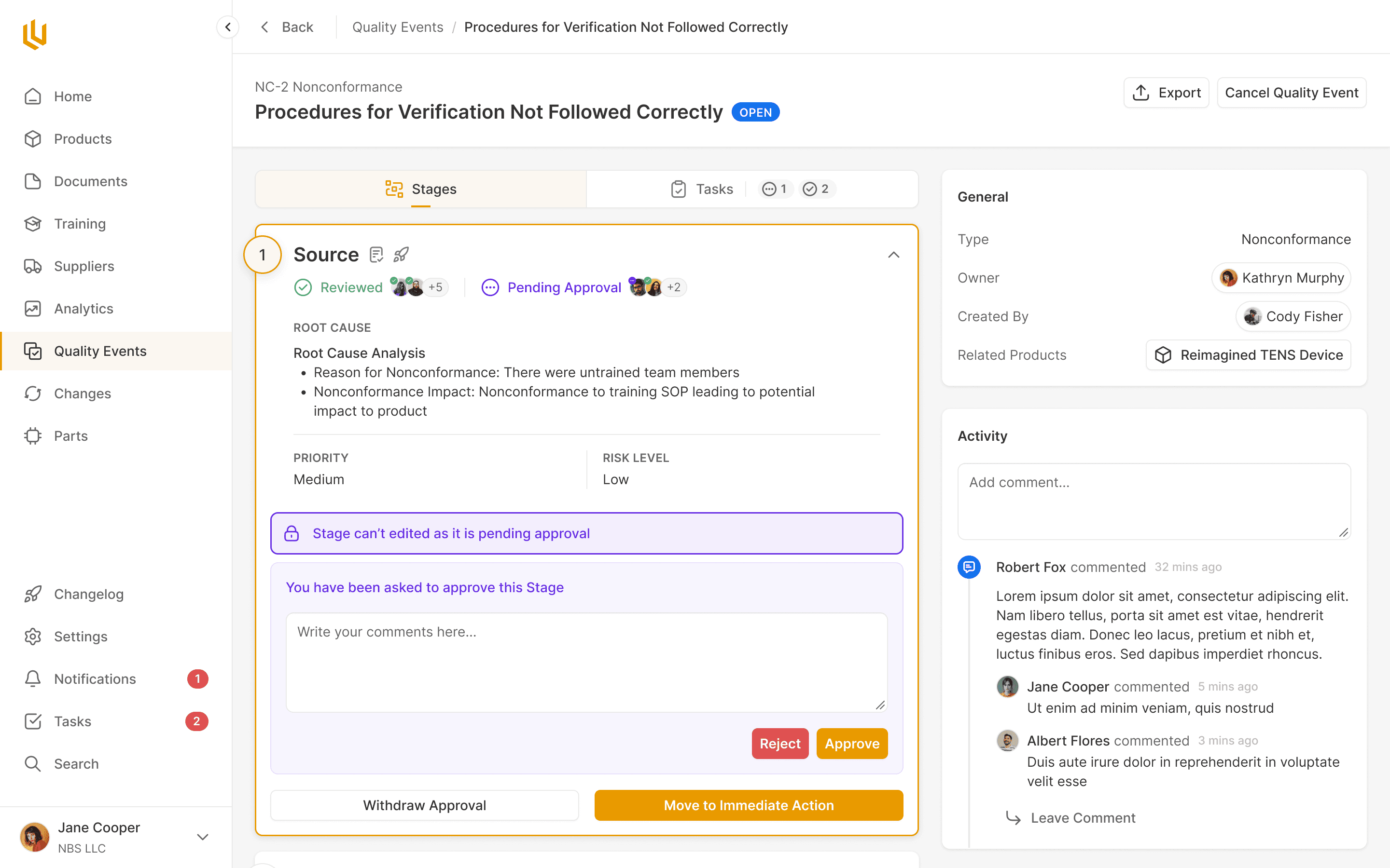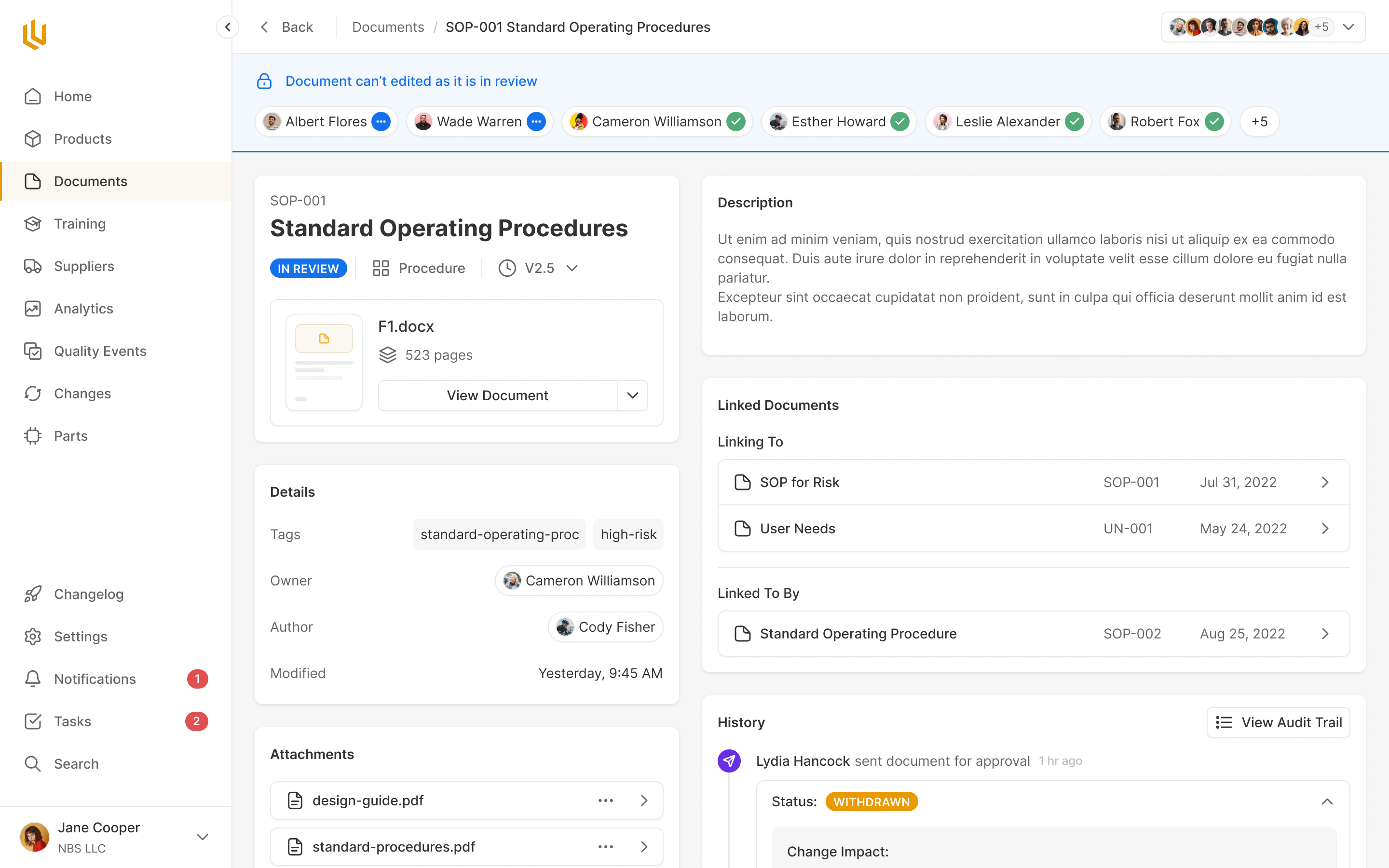 Every core component to a product has to go through a clear approval process. Ultralight streamlines this by pulling together all the information for reviewers to see, and automatically reminding the appropriate team members, handling rejections and approvals seamlessly.