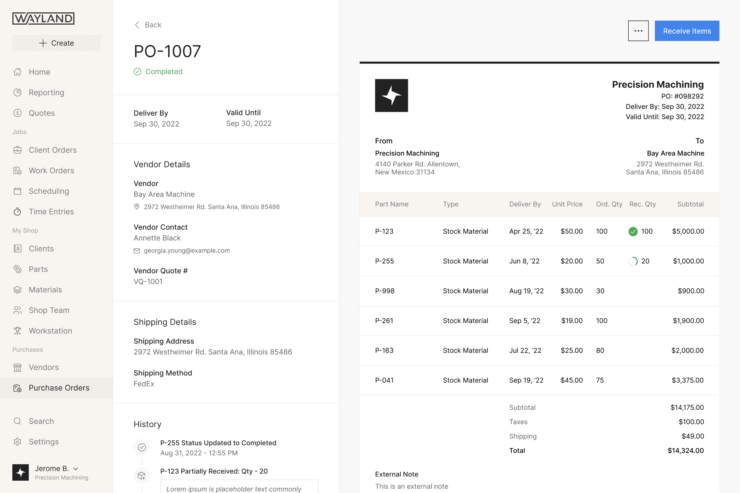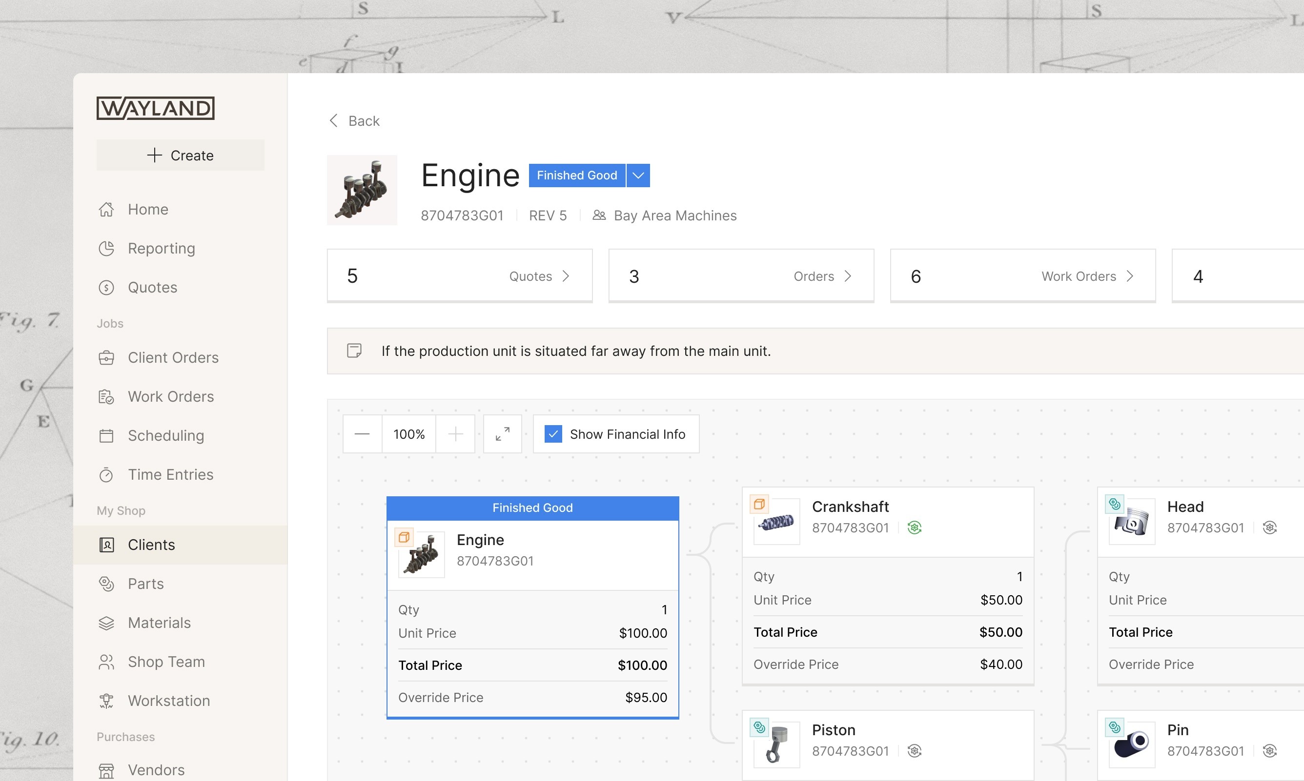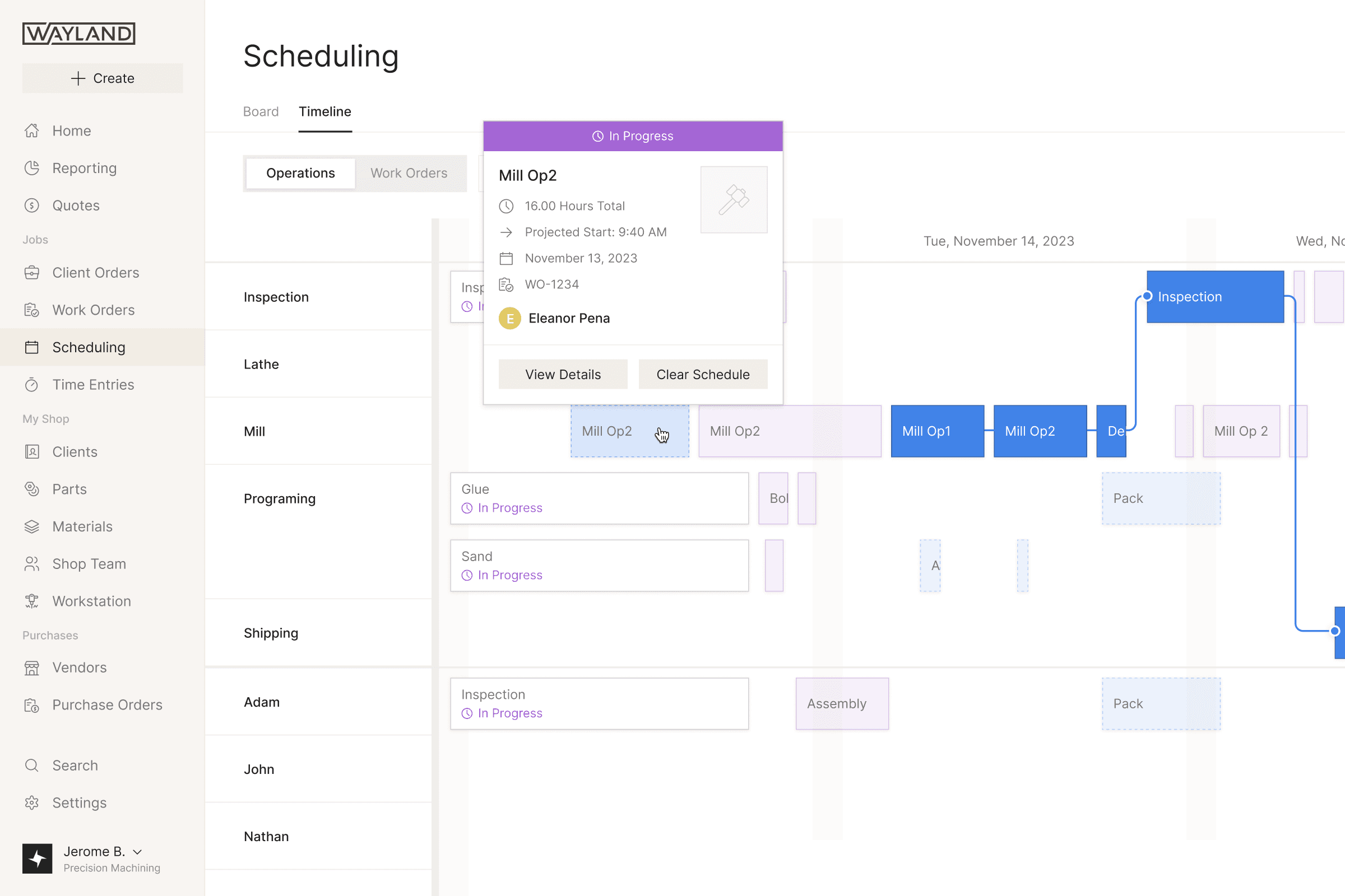 We served as Wayland's 0->1 design partner for two years, helping shape their product and of course visualize its design. We worked closely with industry partners to deeply understand the machine shop process, culminating into a vast application that covered sales, shopfloor management, delivery and more. Wayland was acquired by Fulcrum in 2024.